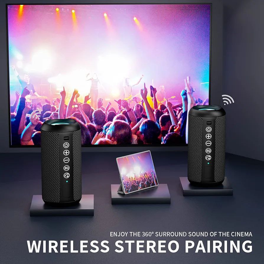 صدای استریو Hi-Fi و جفتسازی دوگانه: بلندگوی بلوتوث Ortizan مجهز به یک بلندگوی درایور صدای استریو ۲۴ وات (12x2 وات)، یک پردازنده سیگنال دیجیتال پیشرفته و دو رادیاتور غیرفعال برای تقویت باس در فضای باز است که صدای زیر واضح، صداهای میانی دقیق و باس ویژه تقویتشده را در هر حجم صدایی پخش میکند. میتوانید همزمان دو بلندگو خریداری کنید تا با استفاده از عملکرد جفتسازی دوگانه، واقعاً از صدای فراگیر یک سینما لذت ببرید، که یک تجربه شنیداری واقعاً بینظیر است.